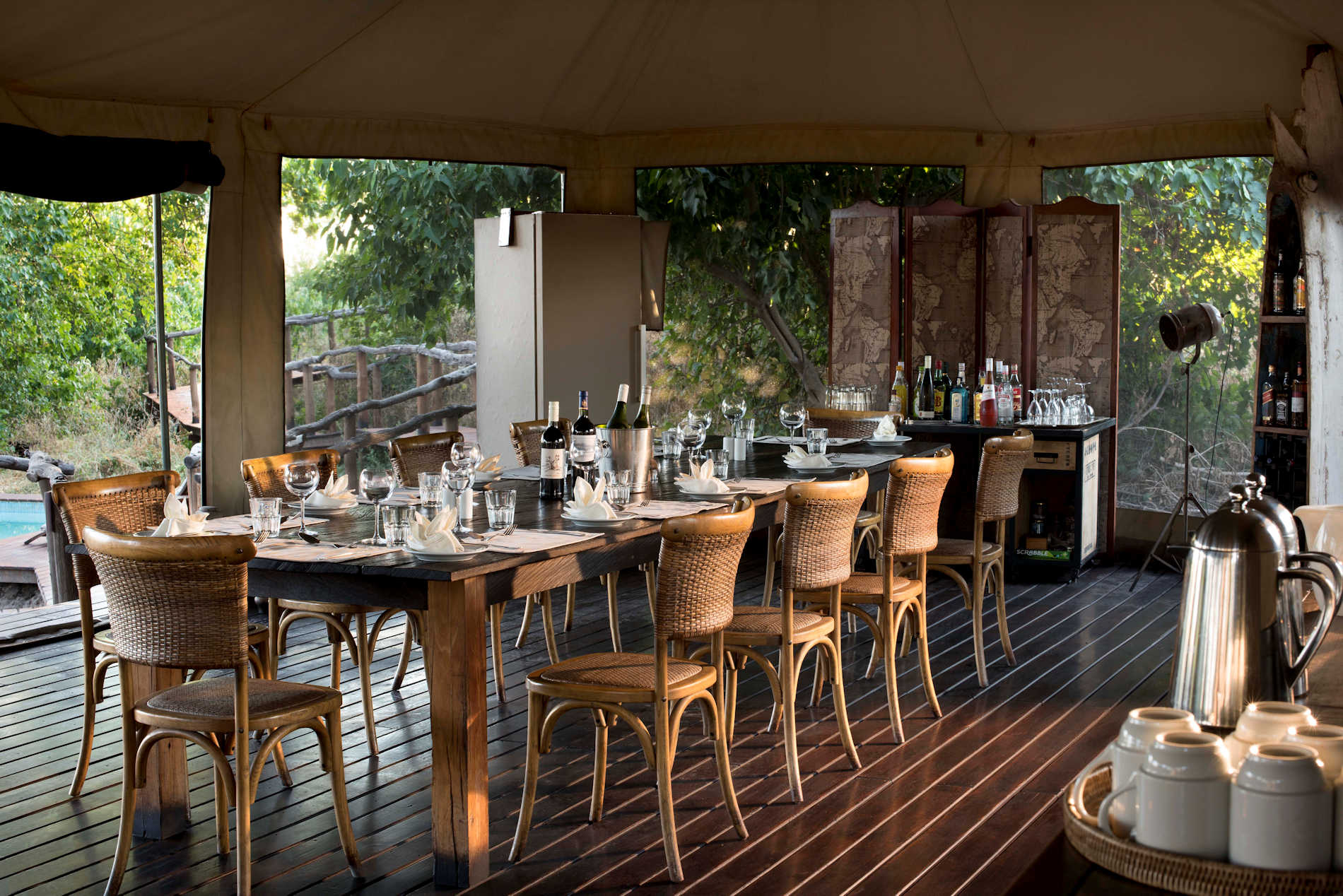 Der zeltartige Hauptbereich von Linyanti Ebony, der als Speisesaal, Lounge, Bar und Treffpunkt dient, ist dem des Linyanti Bush Camps sehr ähnlich, mit einfachen, aber komfortablen Möbeln, die ein traditionelles Gefühl vermitteln. Stufen führen von einer sonnigen Holzterrasse zu einer von Stühlen umgebenen Feuerstelle, und ein kleiner Swimmingpool bietet Abkühlung in der Hitze des Tages.