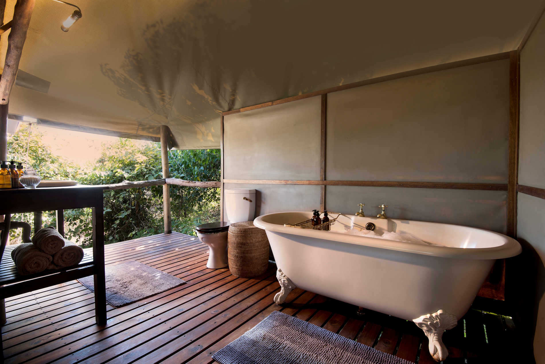 An der Rückseite jedes Zelts befinden sich ein Kleiderschrank und eine Trennwand aus Segeltuch, die das eigene Bad vom Schlafzimmer abtrennt. Das Doppelwaschbecken mit überhängendem Spiegel ist weitgehend zum Raum hin offen, während sich hinter der Trennwand eine Regenduschkabine aus Segeltuch und eine Toilette mit Wasserspülung befinden. Ein Wäschekorb, flauschige Handtücher und Toilettenartikel runden das Bild ab.