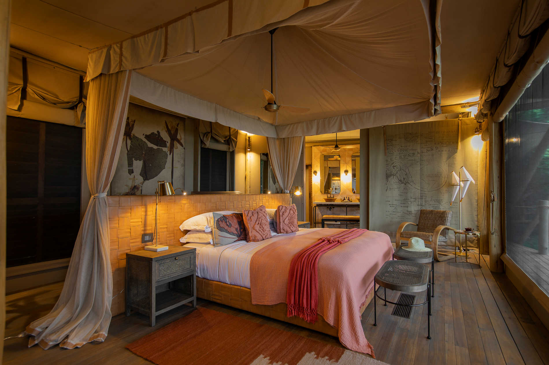 • Luxuriöse Zeltsuiten auf erhöhten Holzdecks mit erhöhten Holzstegen (einige Abschnitte können auf dem Boden liegen, um die Bewegung der Tiere zu ermöglichen).