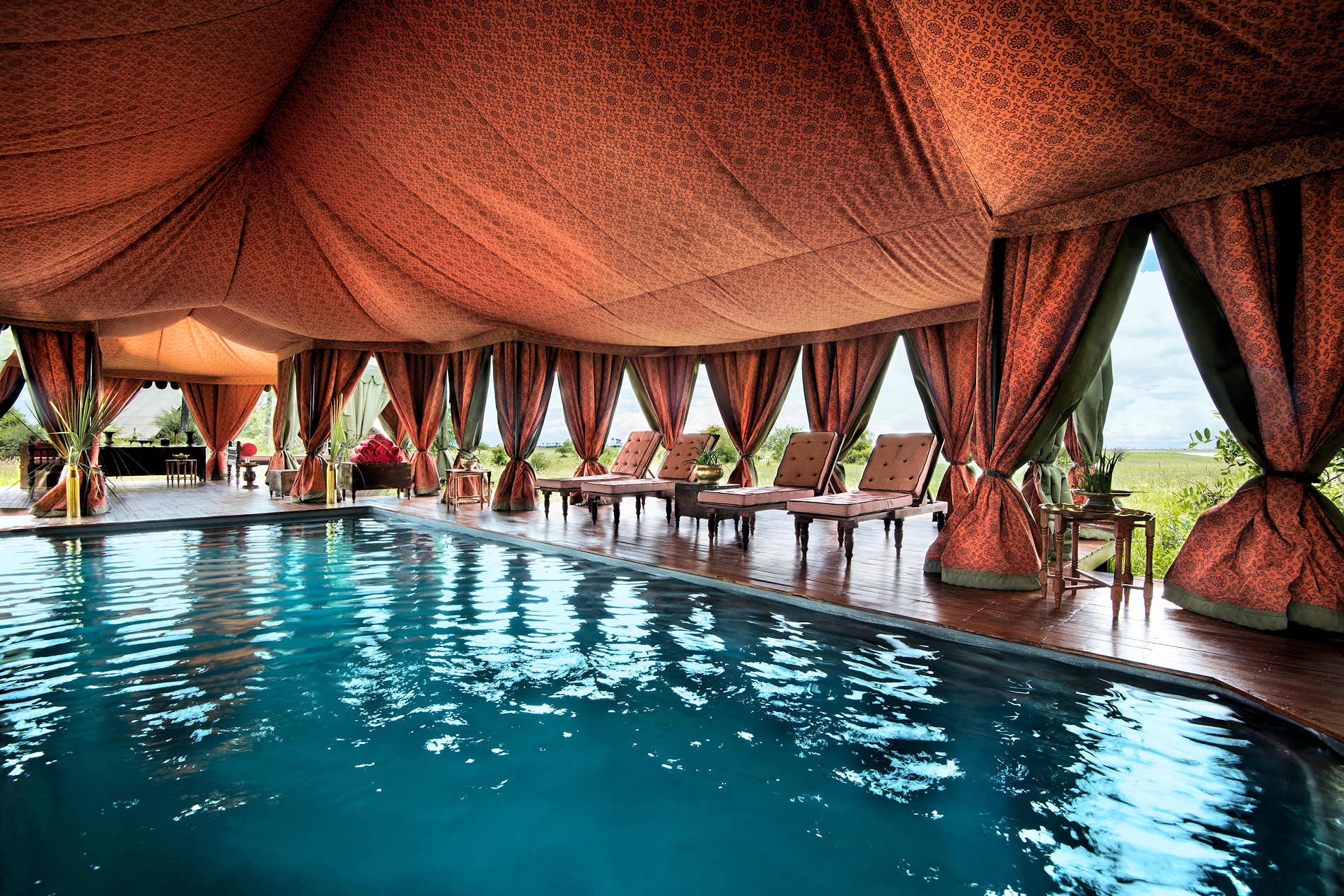 Eine Treppe führt hinunter zu einer Feuerstelle, an der die Gäste abends in geselliger Runde einen Drink unter dem Sternenhimmel genießen können. Einen kurzen Spaziergang entfernt befindet sich ein weiteres riesiges Zelt mit offener Seite, das den Swimmingpool überdacht, der in eine hölzerne Plattform eingebaut und von Liegestühlen umgeben ist. In der anderen Richtung befindet sich ein rundes Beduinenzelt, das mit niedrigen Stühlen und Kissen für den informellen Nachmittagstee ausgestattet ist.