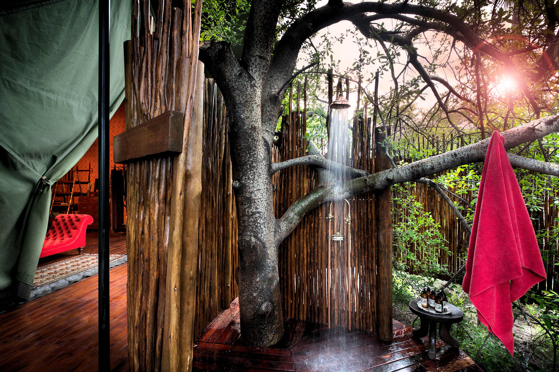 Wege führen zu den zehn Zelten bei Jack’s – das am weitesten entfernte liegt etwa fünf Gehminuten vom Hauptbereich entfernt. Jedes dieser großen, begehbaren Zelte – drei Doppel- und sieben Zweibettzelte – steht auf einer hölzernen Plattform mit einer privaten Holzterrasse, von der aus man einen weiten Blick hat. Das Zelt besteht aus khakigrünem Segeltuch mit gemusterter Verkleidung und öffnet sich durch eine Reißverschlusstür zum Schlafzimmer, in dem sich ein Doppel- oder zwei maßgefertigte Himmelbetten befinden. Es gibt auch eine Sitzecke, einen Schreibtisch, eine Kommode, ein paar Naturkundebücher und ein offenes Regal mit Hängevorrichtung.