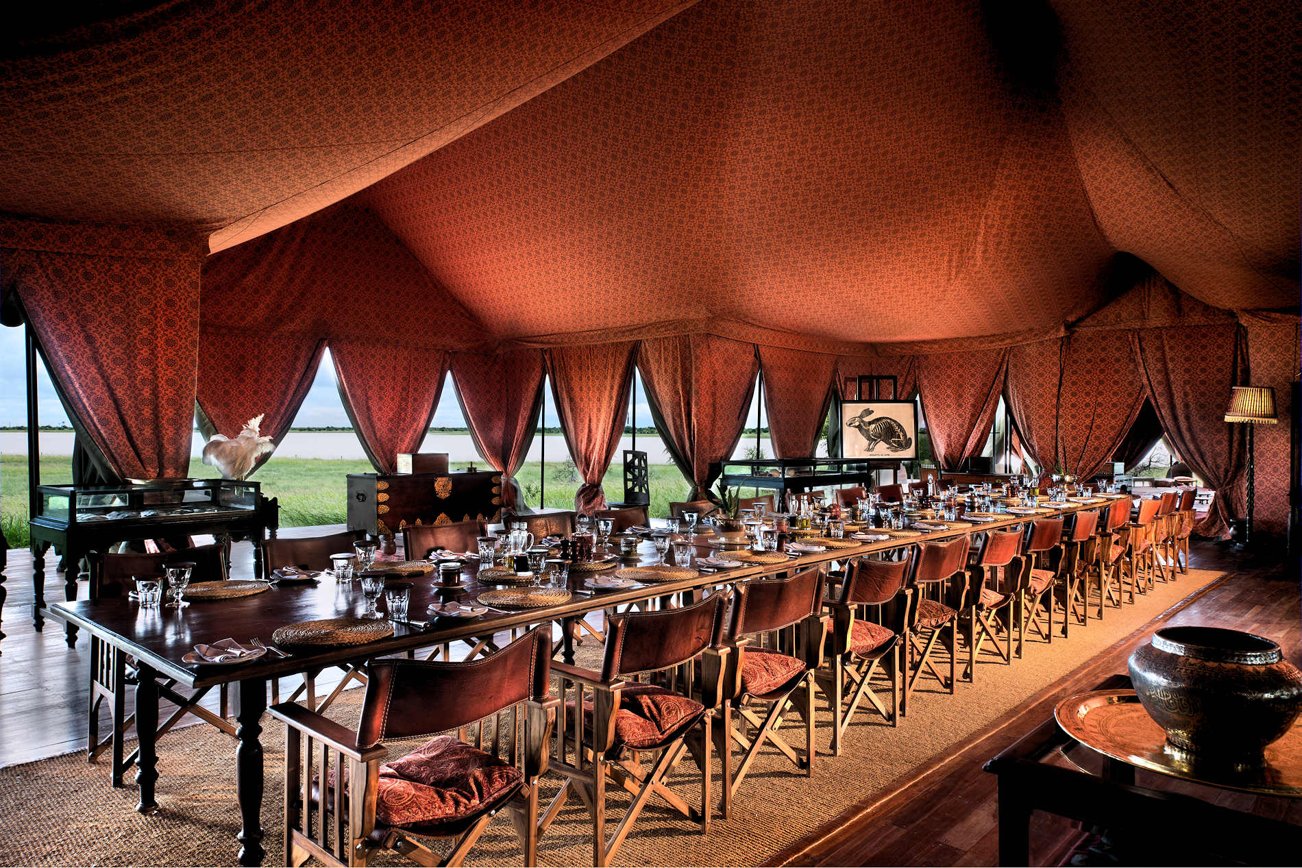 Jack’s Camp selbst ist wunderschön im klassischen Safaristil erbaut und bietet eine einladende und recht romantische Oase in dieser rauen Umgebung. Die Einrichtung des Camps im Stil der frühen Siedler besteht aus einer Mischung aus alten Mahagonimöbeln, persischen Teppichen, marokkanischen und äthiopischen Artefakten und natürlichen Gegenständen wie Straußeneiern und Federn.