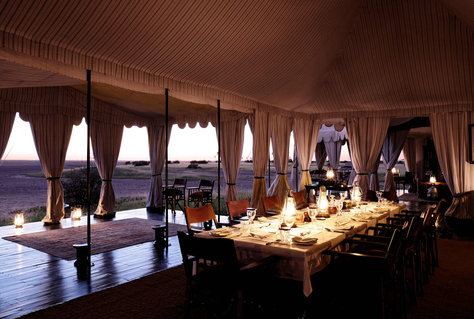 Die Zelte des San Camps, einschließlich des zentralen Bereichs, sind ungewöhnlicherweise aus weißem Segeltuch gefertigt – eine Wahl, die die Strenge der Umgebung ergänzt. Der Hauptpavillon beherbergt einen eleganten Essbereich sowie ein kleines Museum mit einer interessanten Sammlung von Fossilien, Skeletten und Werkzeugen, die in der Umgebung gefunden wurden, sowie Büchern und alten Karten von Afrika. Auf der einen Seite befindet sich eine Bibliothek, in der eine alte Holztruhe als gut bestückte Selbstbedienungsbar dient und eine Ladestation für elektrische Geräte vorhanden ist. Auf der anderen Seite befindet sich ein Teezelt, das auch als Lounge dient und dessen Boden mit Orientteppichen ausgelegt und mit hellen Kissen übersät ist. Dieser zentrale Bereich ist nach außen hin offen und tagsüber kühl und luftig, aber nachts können schwere Segeltuchvorhänge geschlossen werden, um die Kälte abzuhalten. Etwas weiter entfernt befindet sich ein zeltartiger Yogapavillon an einem äußerst abgelegenen und friedlichen Ort.