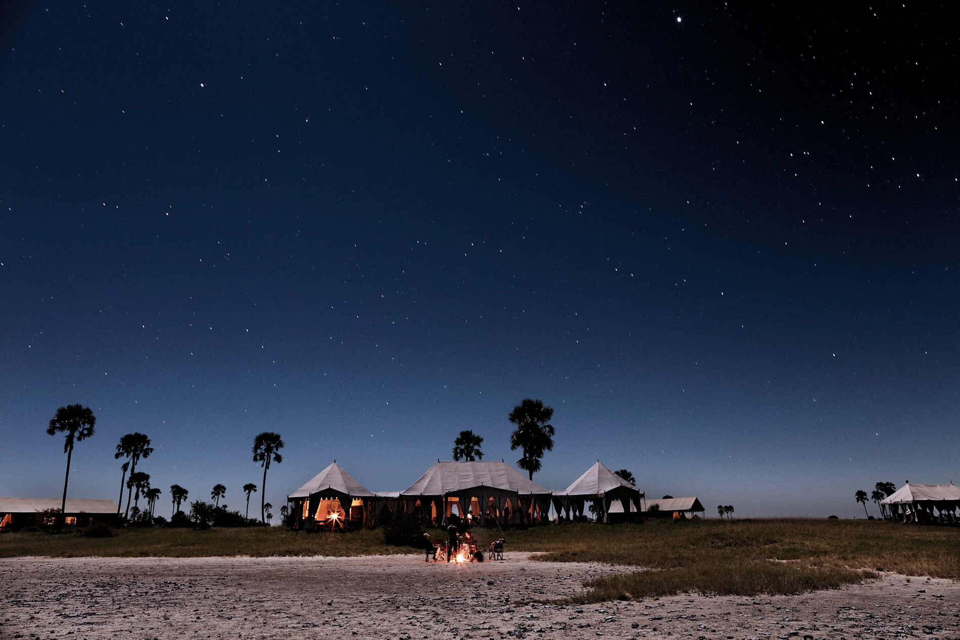 Der wahre Reiz des San Camps liegt in seinem Minimalismus, und das gilt auch für die Umgebung. San liegt am Rande der geheimnisvollen Makgadikgadi-Salzpfannen (mit Blick auf die Nwetwe-Pfanne, um genau zu sein), im Herzen der Kalahari-Wüste und angrenzend an den Makgadikgadi-Nationalpark. Die Pfannen waren einst ein riesiger See, der fast ganz Botswana bedeckte, und sie schimmern scheinbar endlos bis zum Horizont, nur unterbrochen von vereinzelten Wüstenpalmen und Affenbrotbäumen. Das wunderbare Nichts bringt ein kathartisches Gefühl der Stille mit sich, und es gibt wahrhaftig keinen anderen Ort auf der Welt wie diese magische Ecke Botswanas.