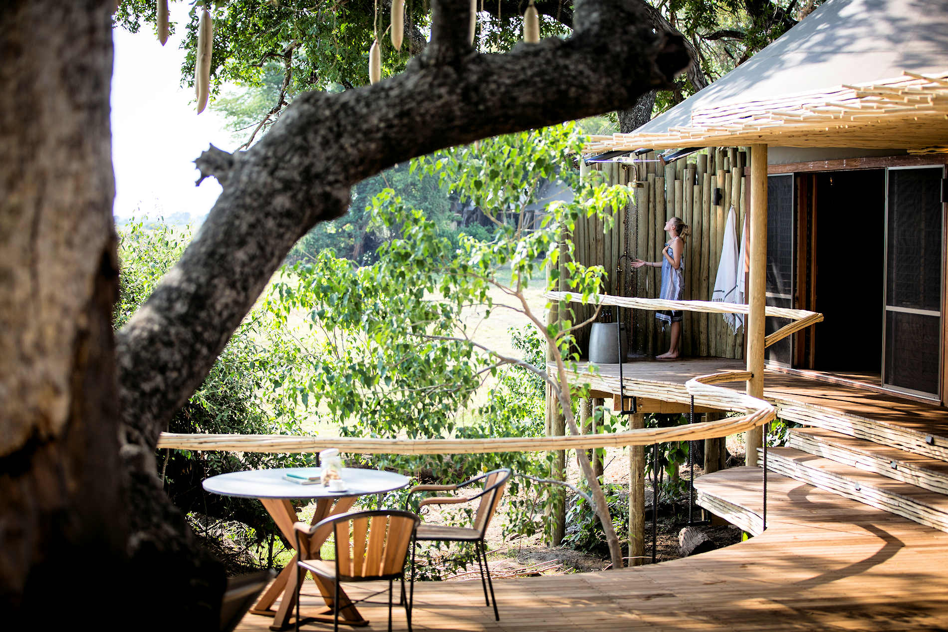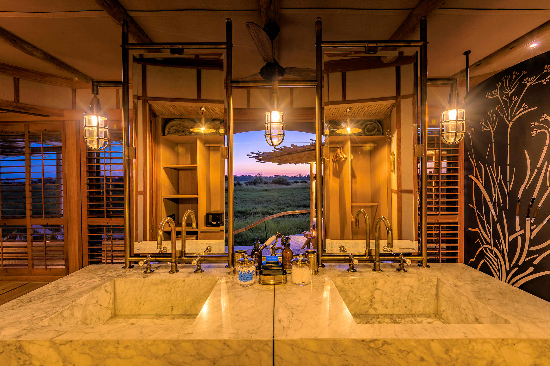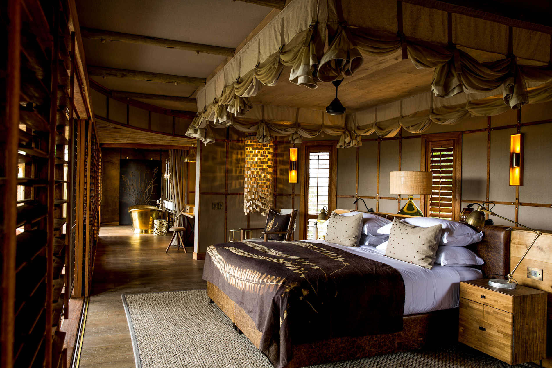 • Luxuriöse Zeltsuite auf einem erhöhten Deck mit erhöhten Holzstegen. • En-suite-Einrichtungen mit doppelter Innendusche, Außendusche, Innenbadewanne, Doppelwaschbecken und separater Toilette sowie einem gut beleuchteten Schminktisch/Kleiderschrankbereich. • Holzfensterläden und Schiebetüren mit Mückenschutz, Moskitonetz, in den Wintermonaten stehen Wärmflaschen und zusätzliche Decken zur Verfügung, elektronischer Safe, Haartrockner, Tee- und Kaffeezubereitungsmöglichkeiten, Minibar, Gymnastikmatte und Gewichte (2 x 1,0 kg und 2 x 2,0 kg). • Tischtelefone nur für Notfälle im Camp (wählen Sie 911, um direkt den Duty Manager anzurufen). • Sala an Deck. • Privates Tauchbecken. • Privates Aussichtsdeck mit schattigem Lounge-Bereich. • Olympus-Ausrüstung (einschließlich Kamera, Objektive und ein Fernglas). • Kostenloses Wi-Fi im Zelt. • Keine Klimaanlage, aber Deckenventilatoren in jedem Zelt (Standventilator auf Anfrage erhältlich). • Zur Ausstattung gehören saisonale Bademäntel, Hausschuhe, Flüssigseife, Waschmittel, Shampoo und Spülung, Körperlotion, Raumspray, Insektenschutzmittel, Insektenspray, Moskitospule, Duschkappen, Kosmetikset mit Wattestäbchen und Wattepads, Nähset, Taschentuchspender, Wäschesack und Regenschirm in jedem Zelt.