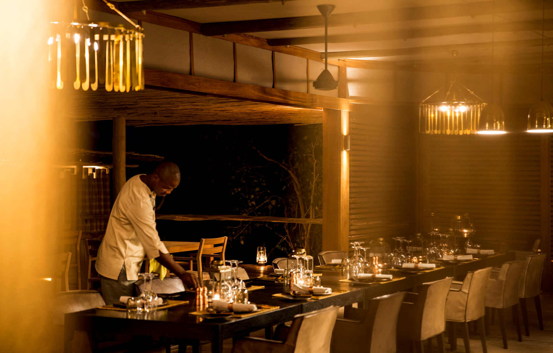 • Bibliothek. • Traditionelle Boma zum Essen unter dem Sternenhimmel. • Feuerstelle. • In den Wintermonaten werden während des Abendessens Schaldecken zur Verfügung gestellt. • Spa mit zwei hauseigenen Spa-Therapeuten, außerdem sind Massagebehandlungen im Zelt möglich (Behandlungen gegen Aufpreis). Mindestalter 12 Jahre – Behandlungen für Kinder/Jugendliche (12 – 16 Jahre) werden mit geringerem Druck und weicheren Ölen durchgeführt und können je nach den Bedürfnissen des Kindes/Jugendlichen kürzer sein. • Gemeinsamer Butler-Service (Modiredi System, was in Setswana “dienen” bedeutet) während des Brunch/Mittagessens und des Abendessens. • Durch ein erhöhtes Holzdeck mit Little Mombo verbunden, mit mehreren gemeinsamen Einrichtungen wie Pool und Fitnessraum, Spa und Safari • Boutique, sowie ein Pizzaofen.