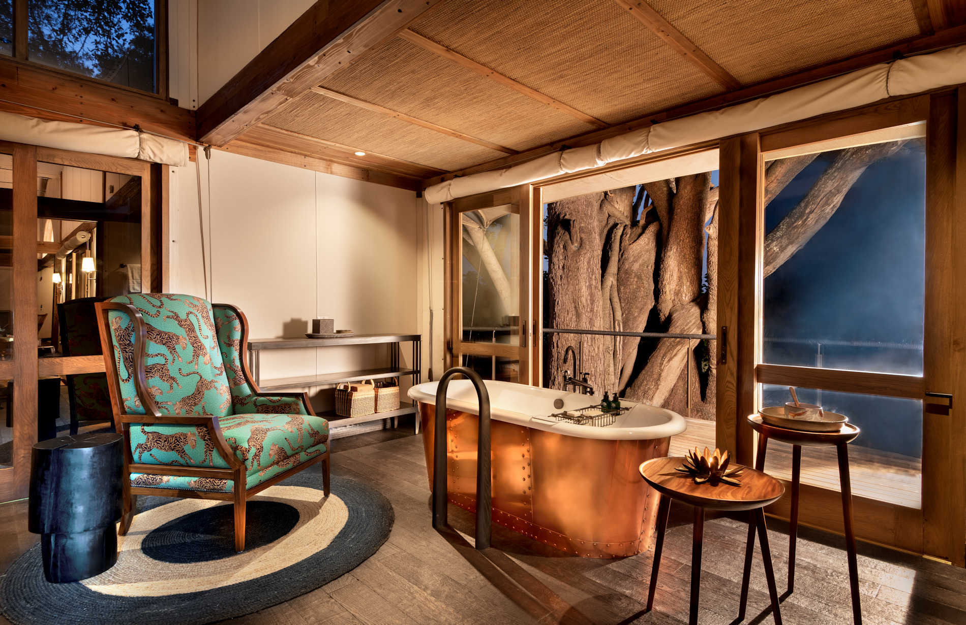 Das Schlafzimmer befindet sich auf der zweiten Ebene und ist wunderschön mit geschnitzten Holzmöbeln von berühmten Designern wie David Krynauw, John Vogel und Adam Birch ausgestattet. Sowohl das Schlafzimmer als auch das Badezimmer haben Zeltwände, die sich komplett nach draußen öffnen lassen oder mit Reißverschlüssen geschlossen werden können. Die Geräusche der umliegenden Vögel, Tiere und Insekten dringen durch die baumartigen Äste und die vergitterten Fenster in die Zeltstruktur.