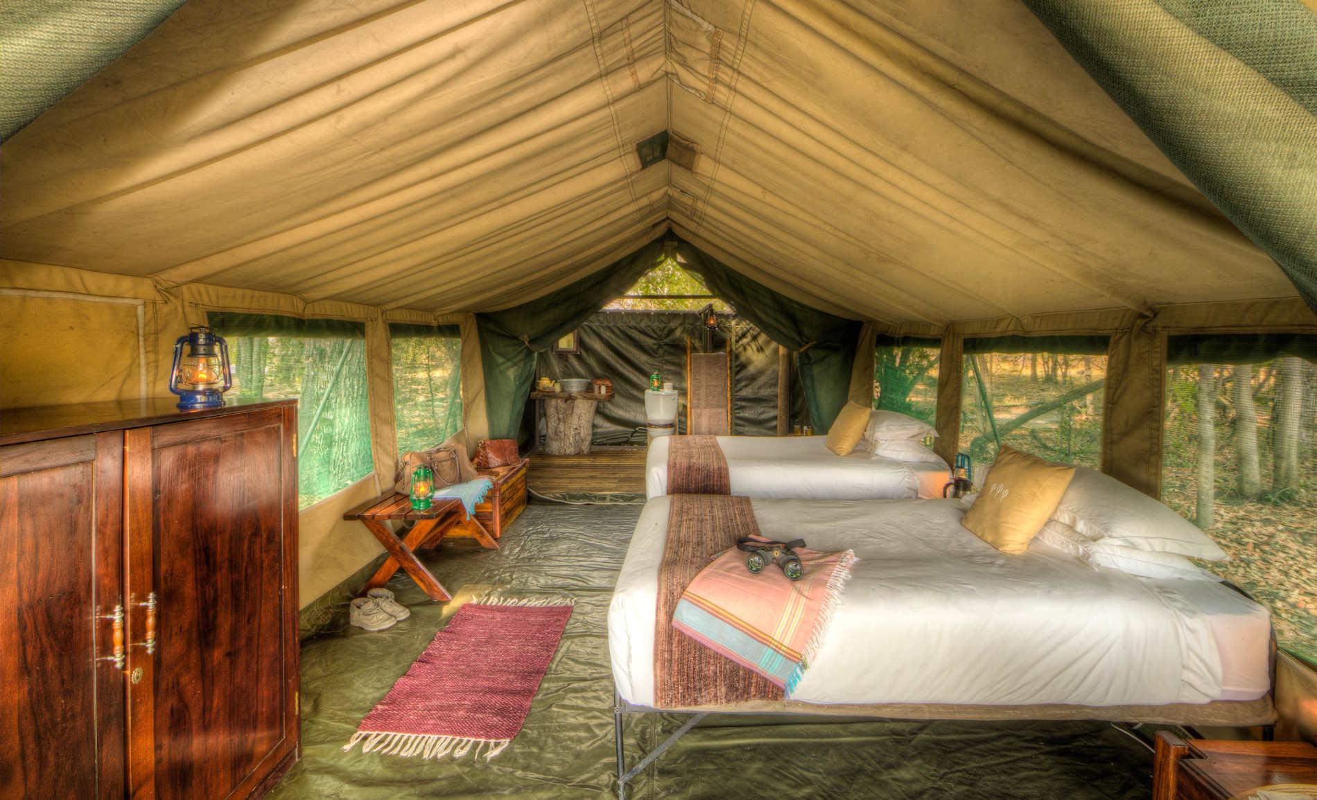 Das Camp hat nur drei Zelte, von denen eines ein Familienzelt mit zwei separaten Räumen ist, in denen bis zu fünf Personen schlafen können. Normalerweise bietet das Camp nur Platz für sechs Gäste, aber wenn es für die exklusive Nutzung durch Familien gebucht wird (weitere Informationen über das Young Explorers Programm finden Sie weiter unten), können es bis zu neun Gäste sein (obwohl das Safari-Fahrzeug bequem nur sechs Personen aufnehmen kann).