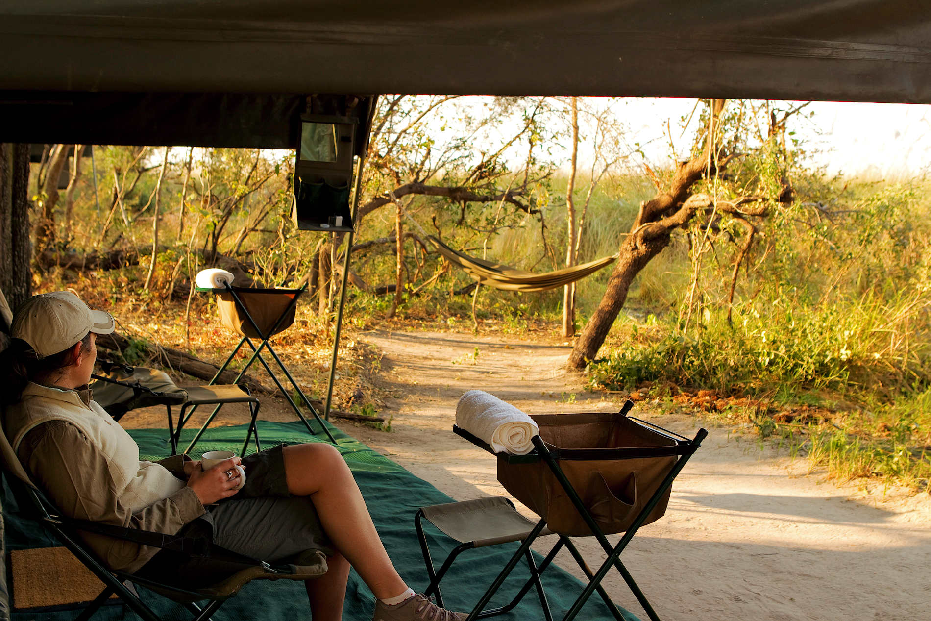 Der Hauptbereich von Footsteps ist nicht mehr als eine Zeltplane mit drei offenen Seiten. Er steht direkt auf dem Sand, in der Nähe der Lagune, und hat keine Teppiche oder polierten Holzböden: Das ist ein Basis-Safari-Camp in seiner besten Form. Hier gibt es einen Esstisch mit Regiestühlen, eine kleine, aber gut ausgestattete Bar aus polierten Stämmen und Ästen sowie eine große Kühlbox mit einer Auswahl an Getränken und viel Eis. Es gibt sogar eine Minibibliothek mit einer gerahmten Karte von Botswana. Ein kleiner Aussichtshügel mit ein paar bequemen Stühlen bietet einen Blick auf die Lagune.