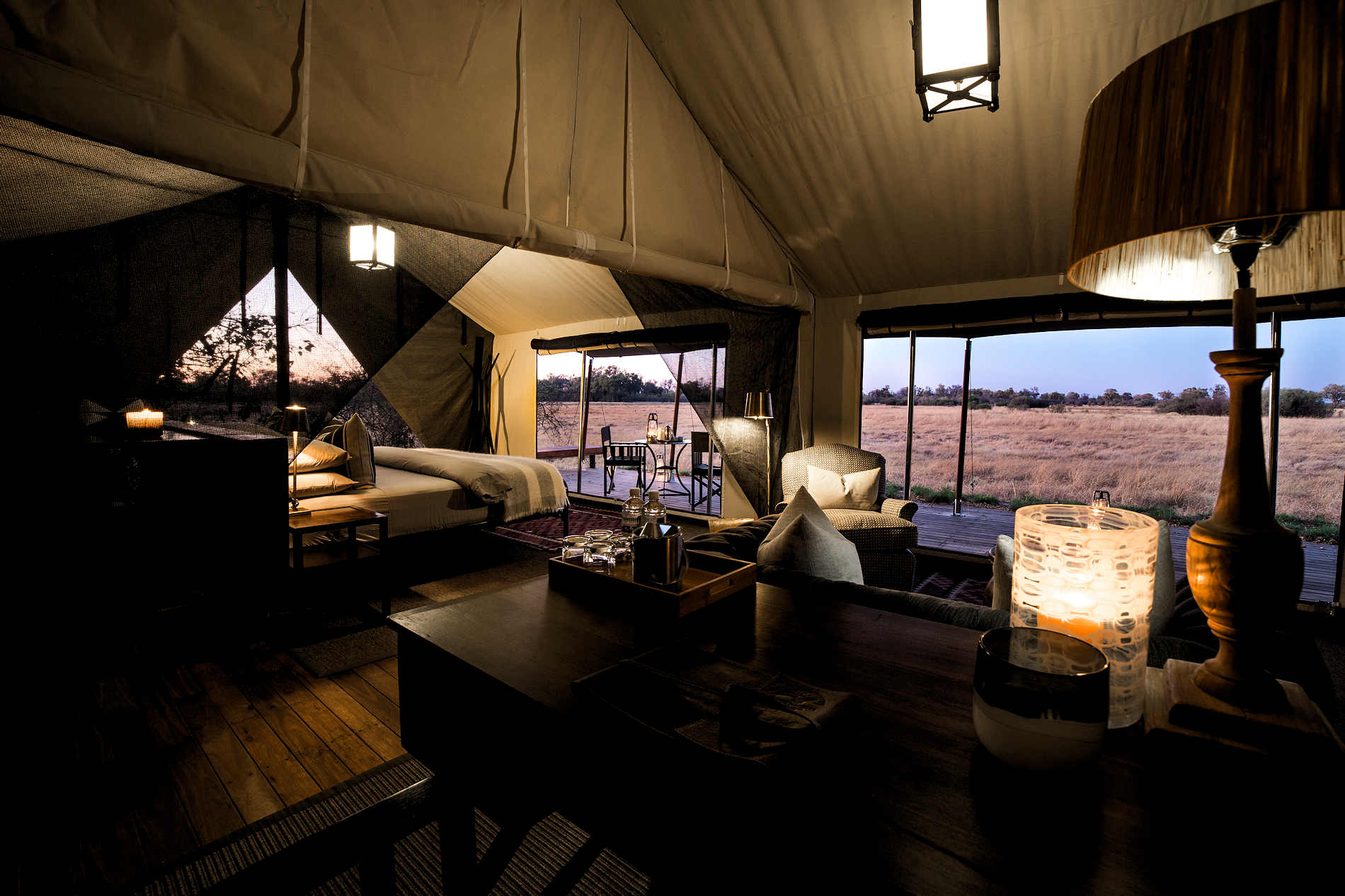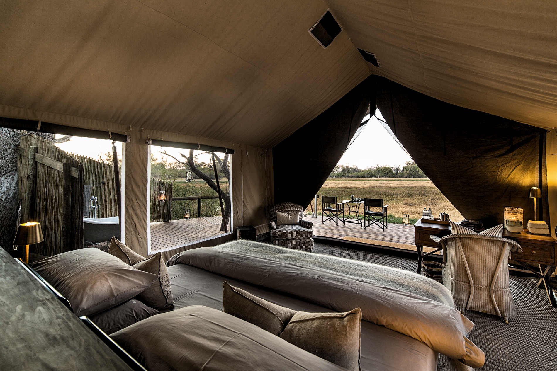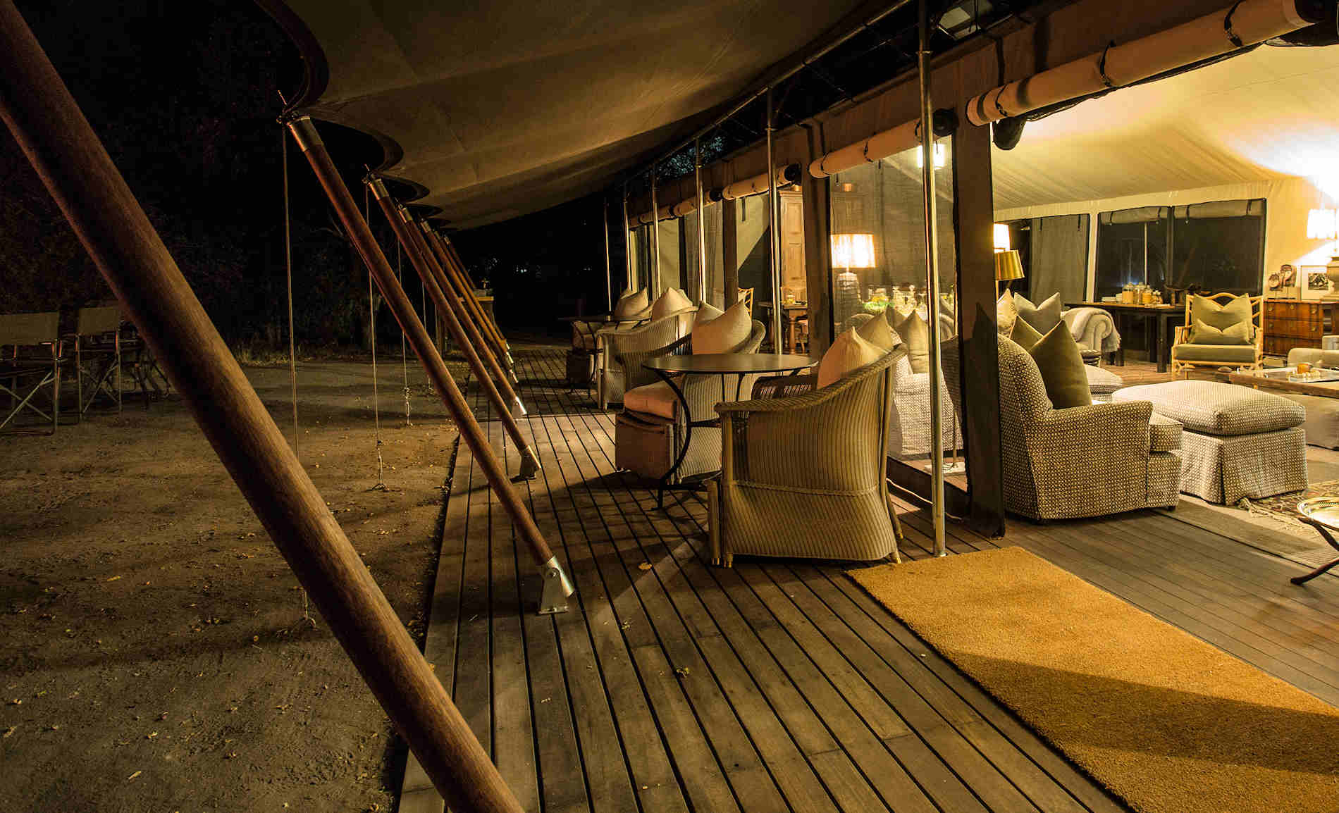 Das Camp ist im klassischen Stil der 1950er Jahre gebaut, mit luxuriösen Safarizelten, en-suite Badezimmern und Wohnbereichen, nicht zu vergessen die romantischen Duschen im Freien. Alle Zelte stehen auf Terrassen und die Wege zu den Zelten schlängeln sich zwischen den großen Bäumen am Fluss. Der Hauptspeise- und Barbereich befindet sich ebenfalls auf Holzdecks mit Blick auf eine große Überschwemmungsebene.