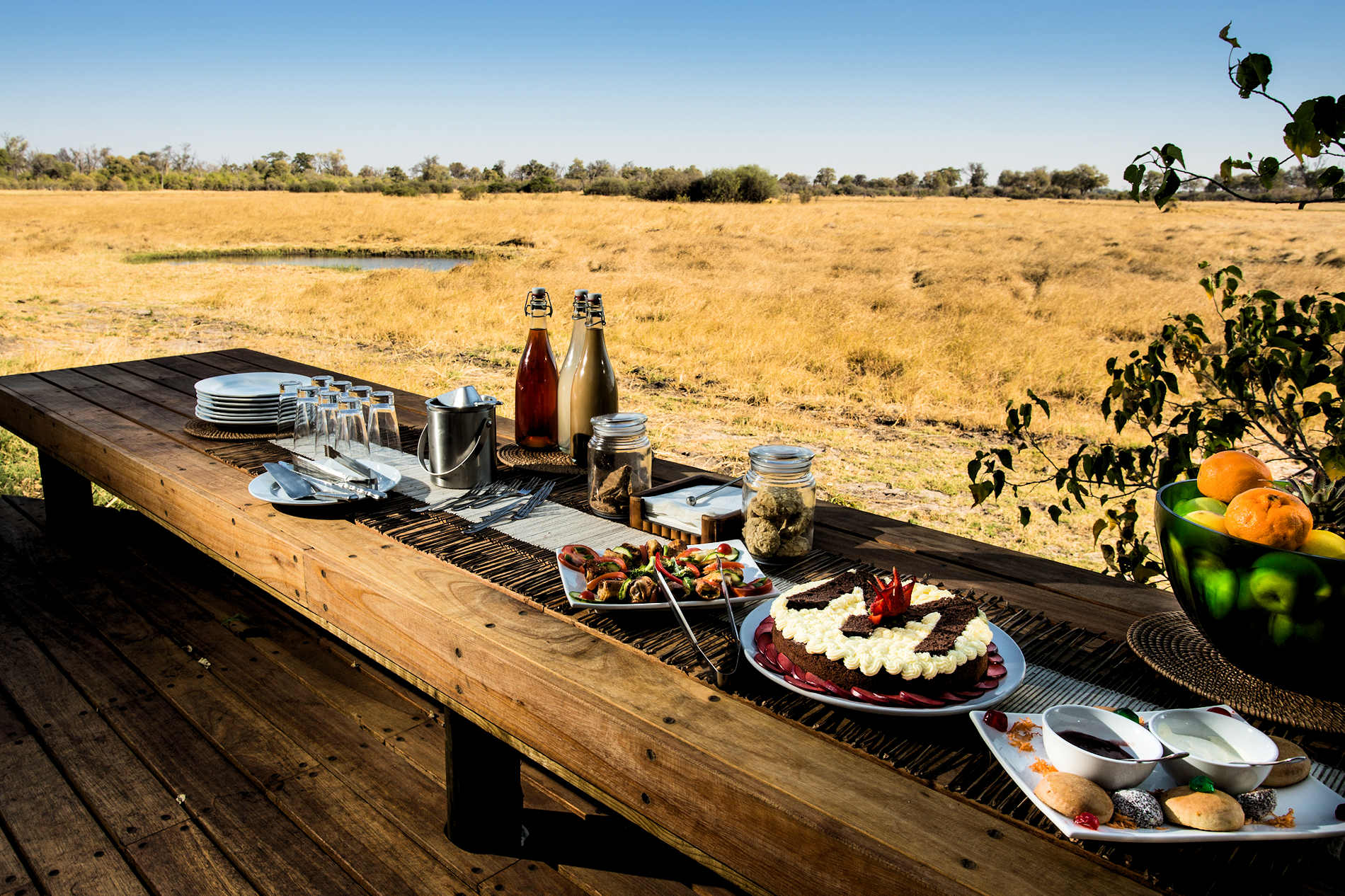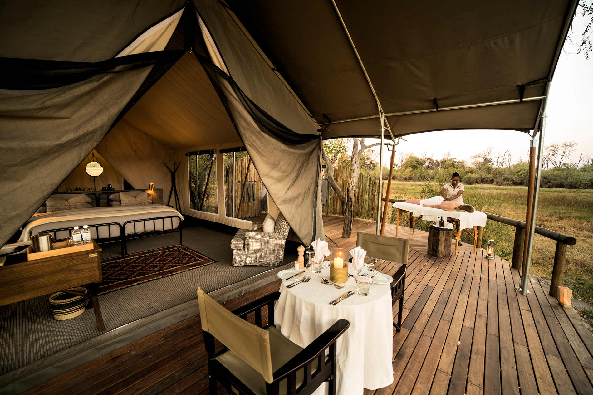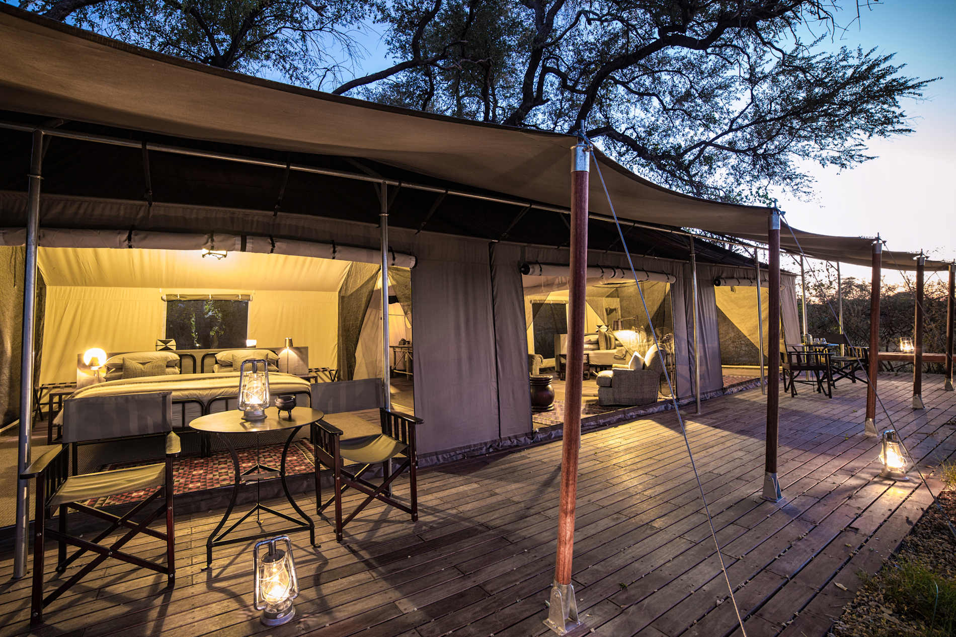 Das Camp ist im klassischen Stil der 1950er Jahre gebaut, mit luxuriösen Safarizelten, en-suite Badezimmern und Wohnbereichen, nicht zu vergessen die romantischen Duschen im Freien. Alle Zelte stehen auf Terrassen und die Wege zu den Zelten schlängeln sich zwischen den großen Bäumen am Fluss. Der Hauptspeise- und Barbereich befindet sich ebenfalls auf Holzdecks mit Blick auf eine große Überschwemmungsebene.