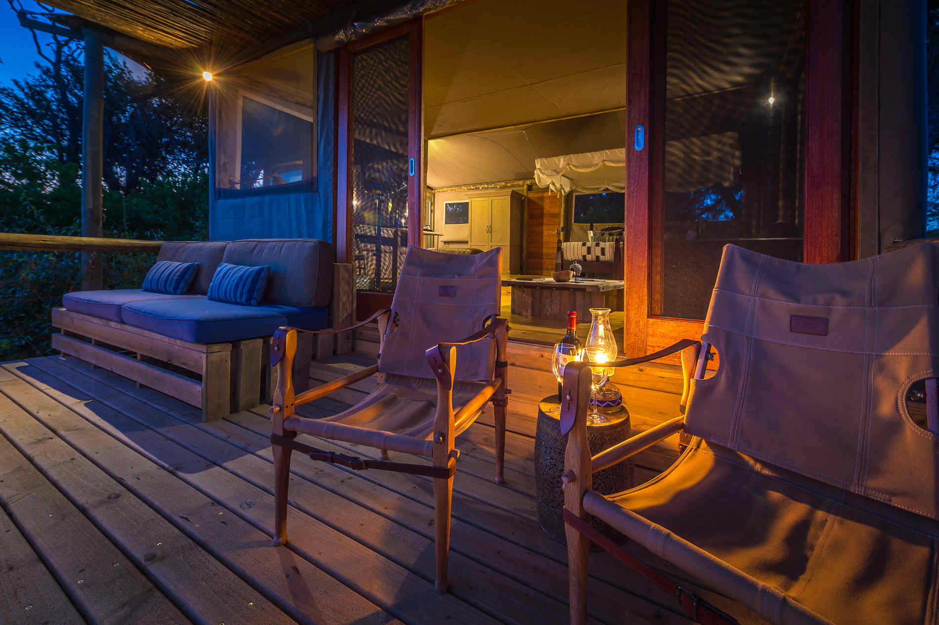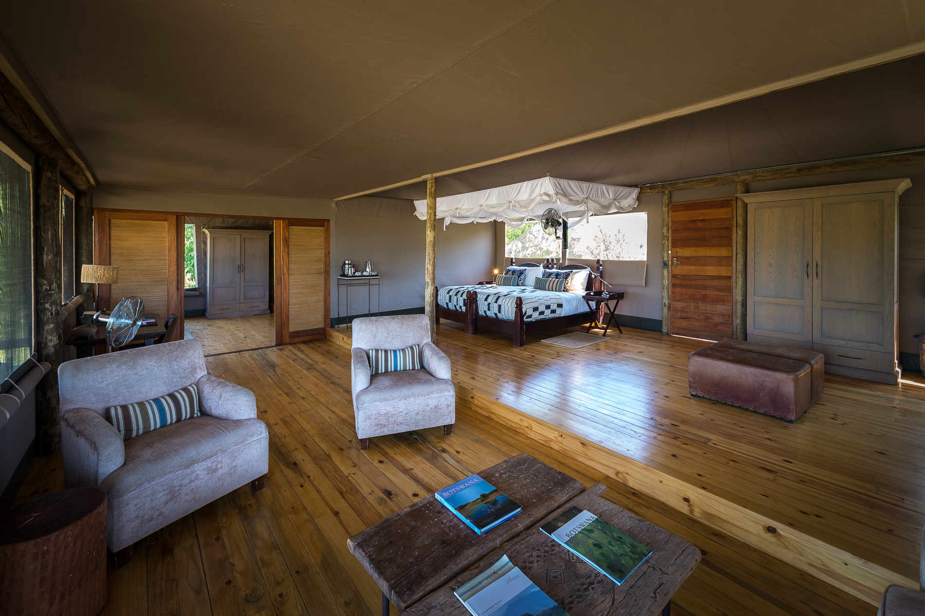 Zeltunterkünfte auf einer erhöhten Holzterrasse mit sandigen Wegen auf dem Boden. Jedes Zelt ist landschaftlich gestaltet und bietet Ausblicke auf die Umgebung. Es verfügt über ein eigenes Bad (eine Einheit hat eine Innendusche und eine Außenbadewanne), eine separate Toilette, eine versenkte Sitzecke, Sessel, ein Moskitonetz, Tee- und Kaffeezubereitungsmöglichkeiten (heißes Wasser wird morgens oder auf Anfrage bereitgestellt), einen Haartrockner, einen elektronischen Safe, eine Olympus-Ausrüstung (einschließlich einer Kamera und eines Fernglases), eine Yogamatte, Gewichte (2 x 1 kg und 2 x 2 kg Gewichte) und Widerstandsbänder.