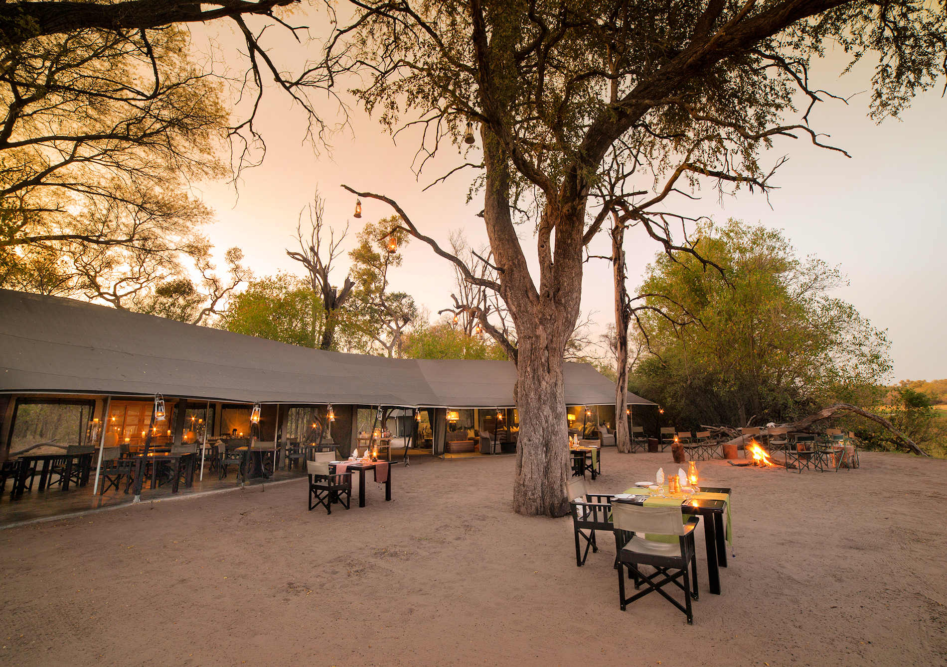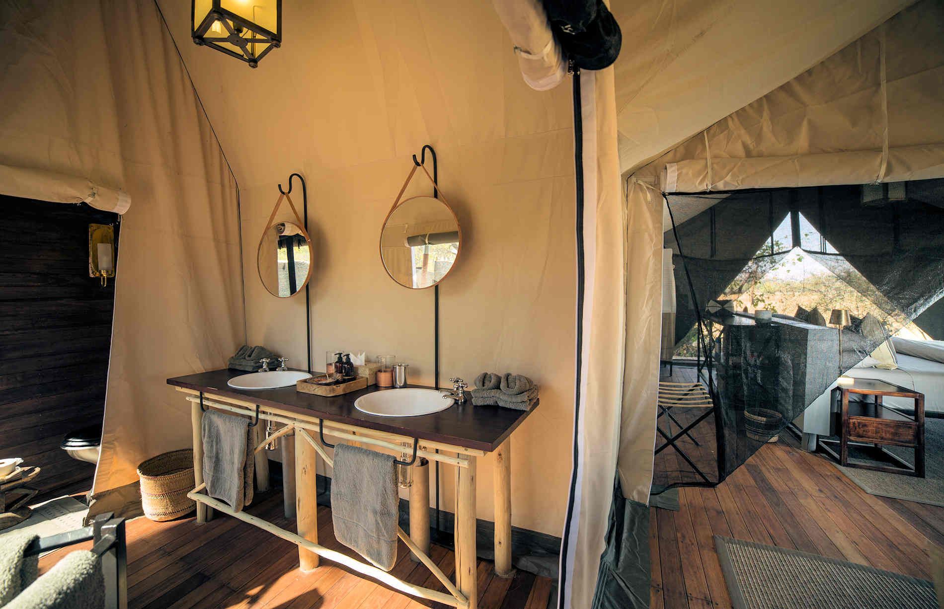 Das Camp ist im klassischen Stil der 1950er Jahre erbaut, mit luxuriösen Safarizelten, en-suite Badezimmern und Wohnbereichen, nicht zu vergessen nicht zu vergessen die romantischen Duschen im Freien. Alle Zelte sind ebenerdig gelegen und die Wege zu den Zelten zu den Zelten schlängeln sich zwischen den großen Bäumen am Fluss.