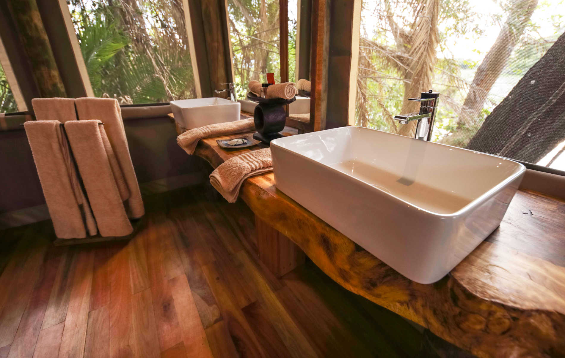 Jedes Chalet befindet sich in privater Lage auf einem eigenen Teakholzdeck. Die Schlafzimmer sind ruhige Zufluchtsorte mit offenem Zugang zu einem Sitzbereich auf einem privaten Deck. Jeden Abend werden die Betten der Gäste abgezogen, und wenn es kühl ist, werden Wärmflaschen unter den Decken versteckt, um die müden Gäste zu überraschen. In jedem Zimmer und an der Rezeption gibt es einen Safe für die Wertsachen der Gäste.