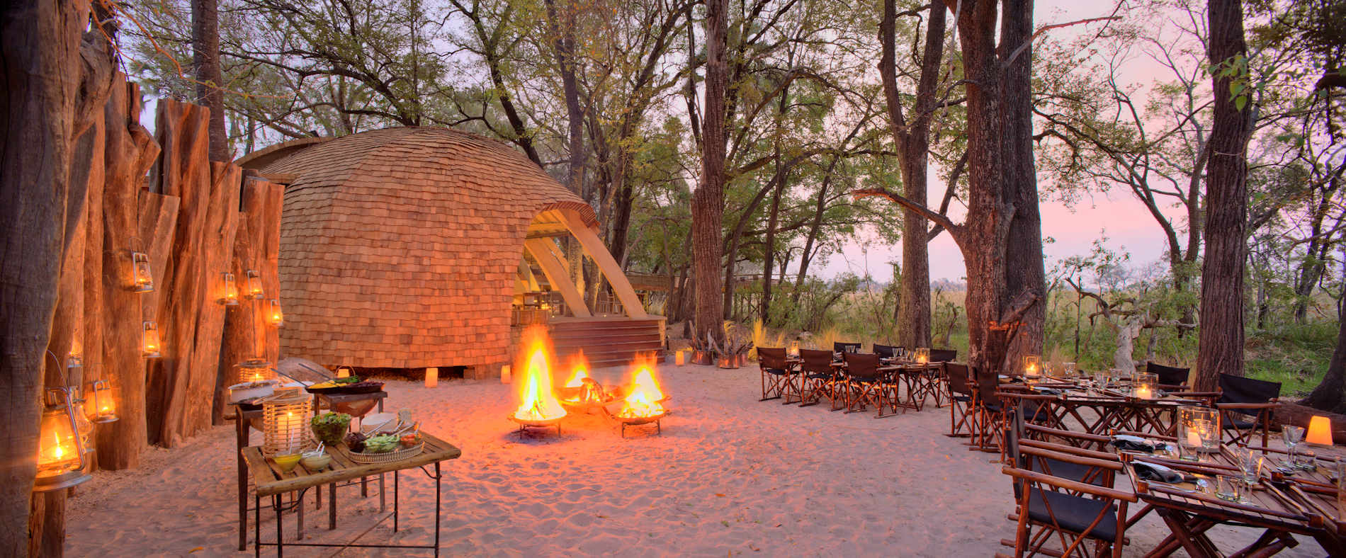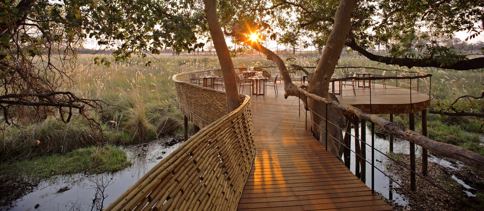 Sandibe liegt im Okavango Delta, dem weltbekannten „Land aus Wasser” in Botswana. Acht deluxe riedgedeckte Cottages mit festen Steinmauern und das architektonisch außergewöhnliche Haupthaus integrieren sich in den Baumbestand an einem der zahllosen von dichtem Papyrus bewachsenen kleinen Flussläufe. Die Cottages verfügen alle über ein Badezimmer, Toilette, Außendusche und eine private teilweise hochgestellte Holzveranda, von der man über den Santantebi Fluss hinausschaut.