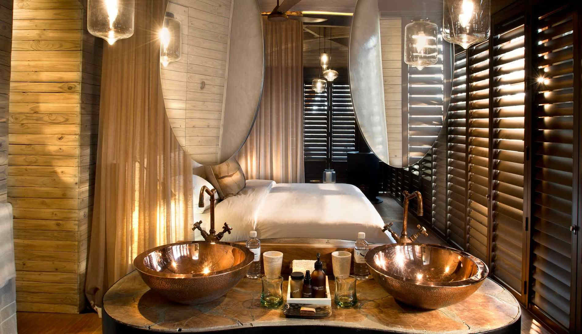 Die geräumigen Cottages sind in warmem Ocker gehalten und mit passenden Stoffen und Materialien ausgestattet wie handgewebte Bodenmatten, Kupfer und rau bearbeitetes Holz. Dank eines leisen Stromgenerators, Solarenergie und dem Fehlen lauter Klimaanlagen ist Ihr Komfort gesichert, ohne dass die Umwelt unnötig belastet und die Ruhe der Natur gestört wird.