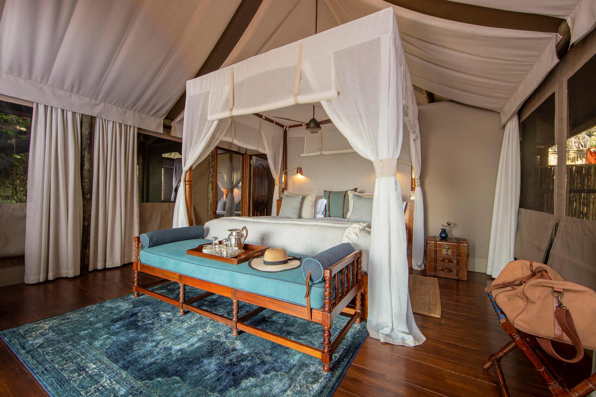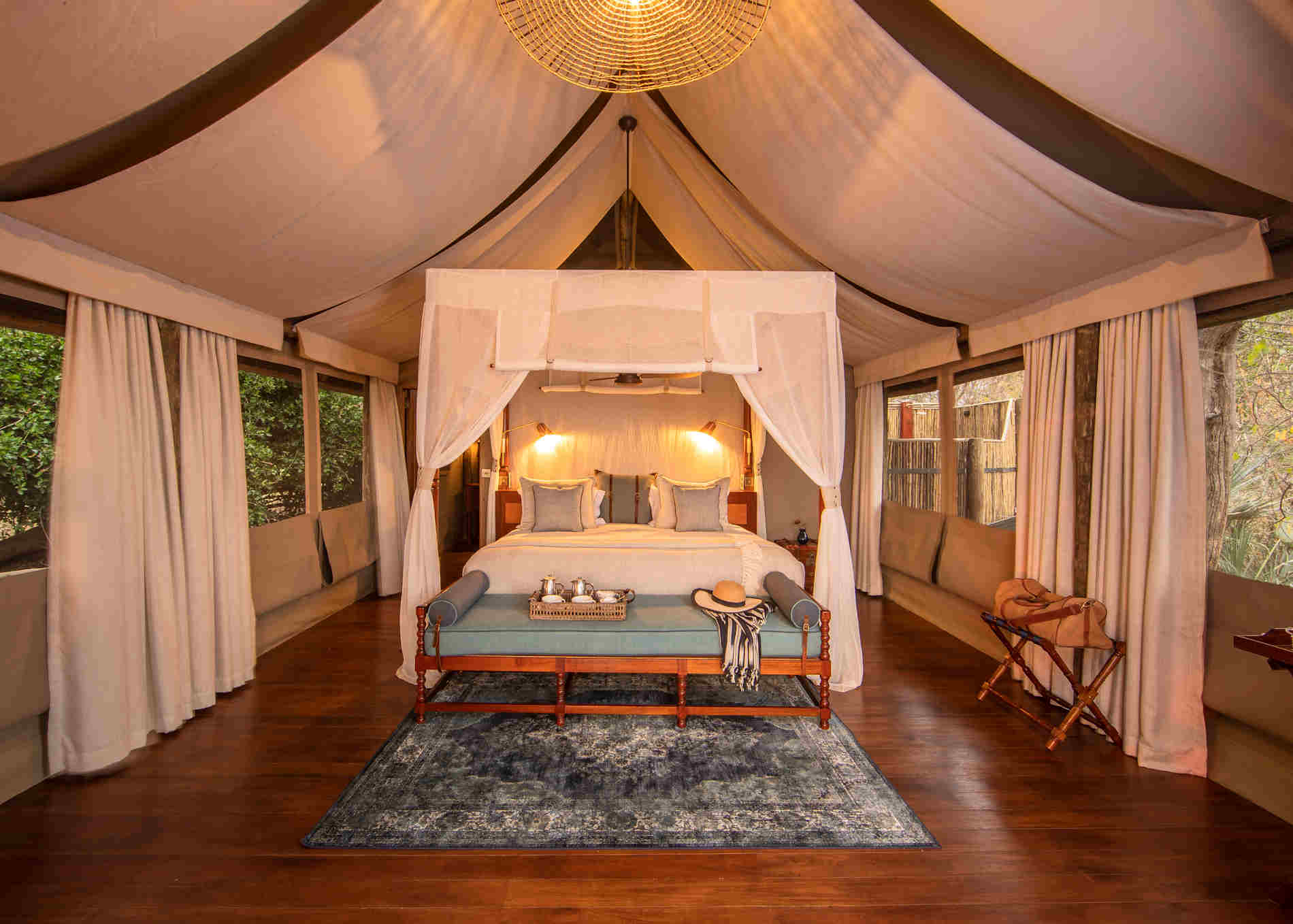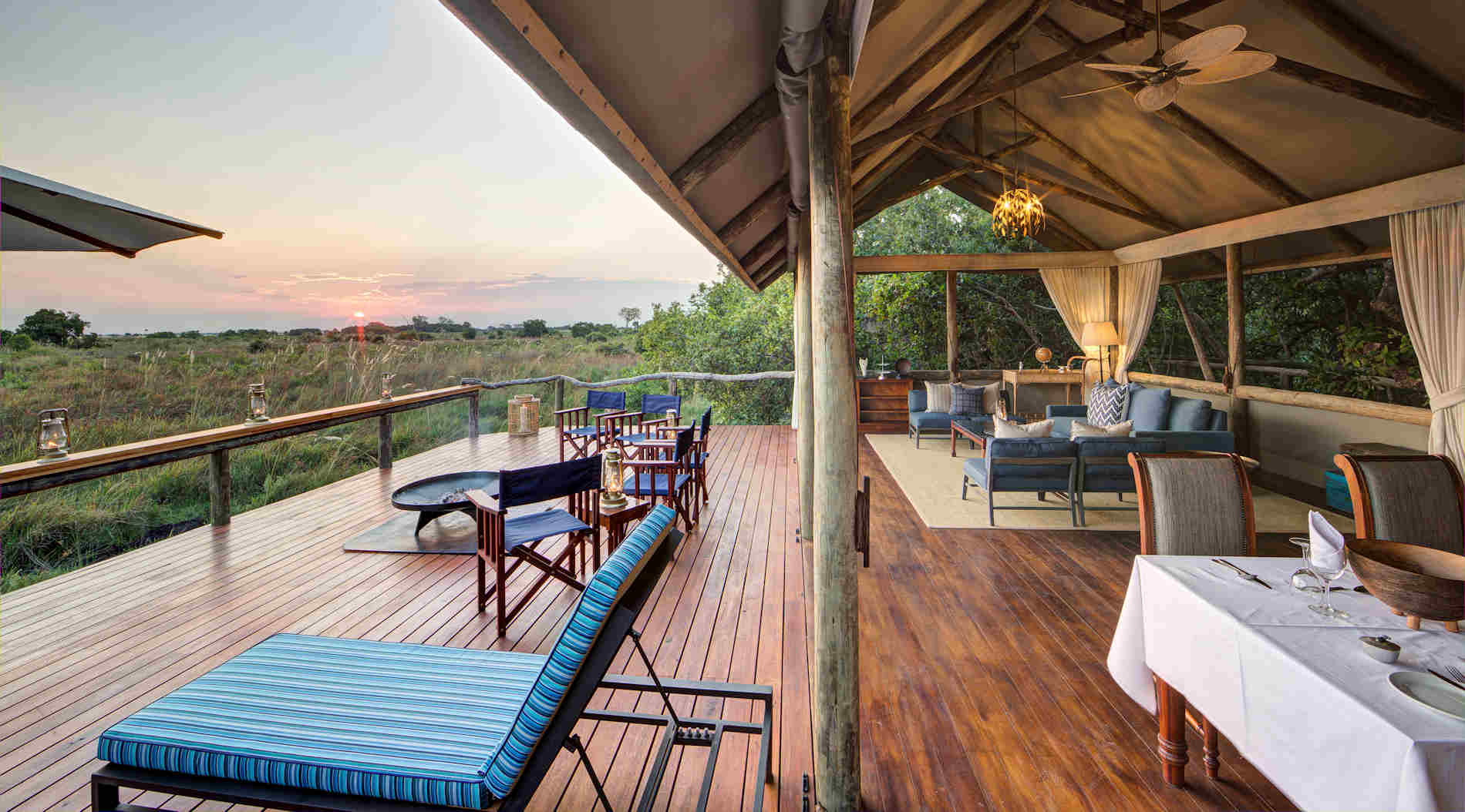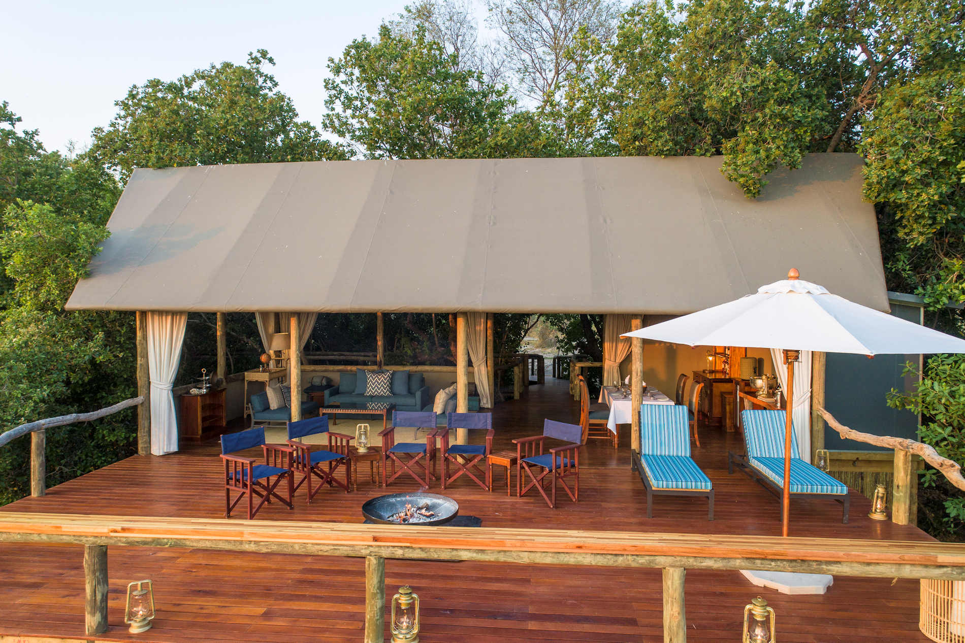 - drei klassische Safari-Zelte auf höher gelegenen Decks